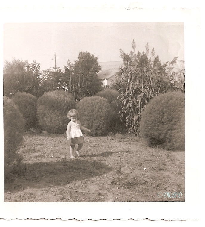 Life on the farm/tree nursery was idyllic to a little youngster, plenty of room to run free and explore. Jasper had planted beautiful peony gardens for Bertha, gardens filled with perennials, bulbs like tulips and lilies and a big vegetable garden, which kept us fed year round. There was an orchard, with a little creek running by the back side of it and plenty of trees to climb and build forts in and two big barns to explore. There were cherry trees and pear trees, raspberries, walnut trees and pecan trees. There were even gooseberry shrubs. He tried his hand at grafting fruit trees and was quite good at it. When we were little tykes like in the above photo, there were chickens and sheep (baby lambs), as well as hogs.