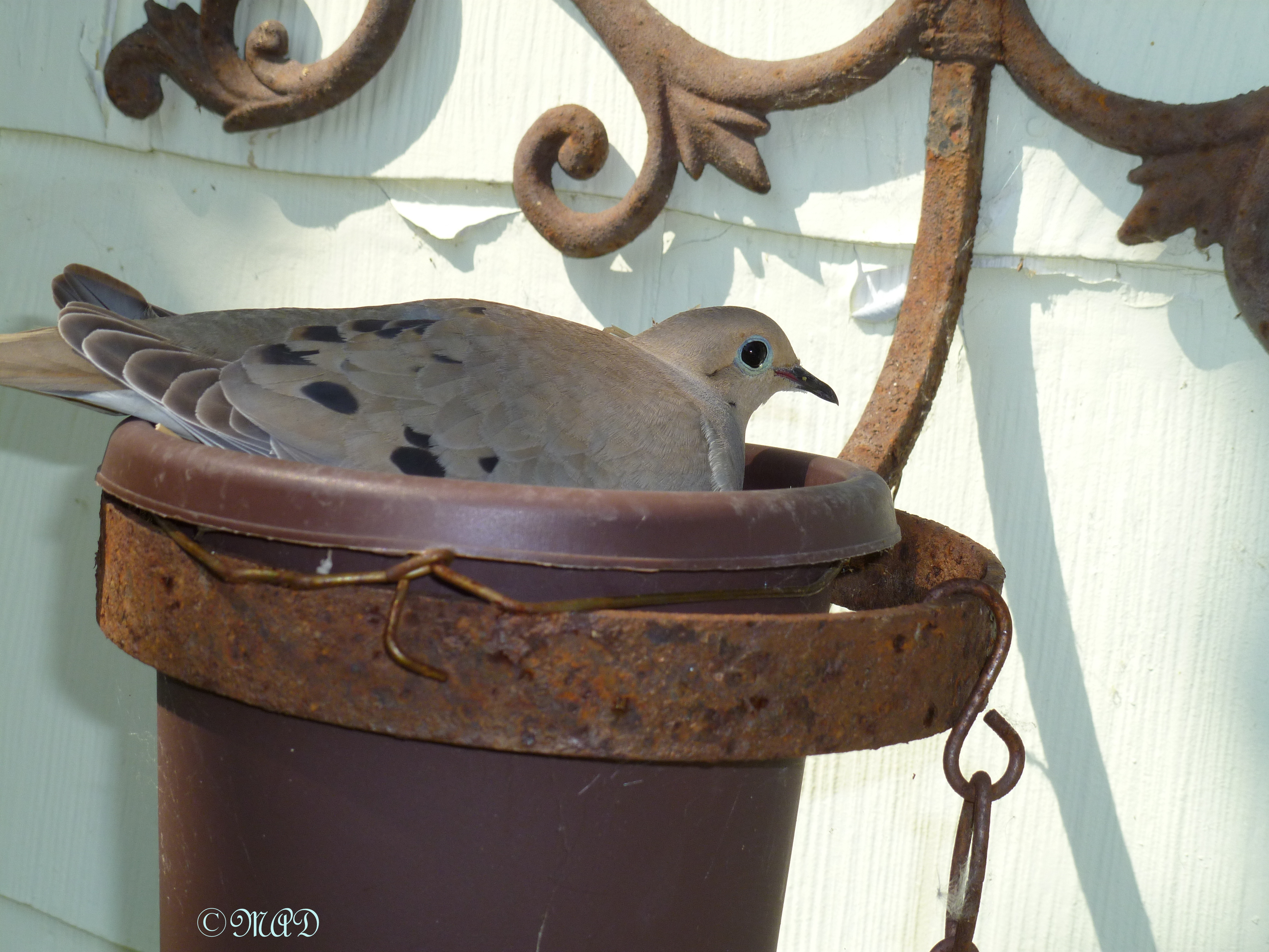 In the Spring of 2012, I was preparing to put some flowers in these hanging pots on my garage.  Imagine my surprise when I looked up and realized that a sweet dove had taken up residence in one of them.  It’s an ideal spot to safely raise a brood.  She eventually hatched out 2 little baby doves and soon trained them to fly and they were off and gone.  June 6, 2012 001