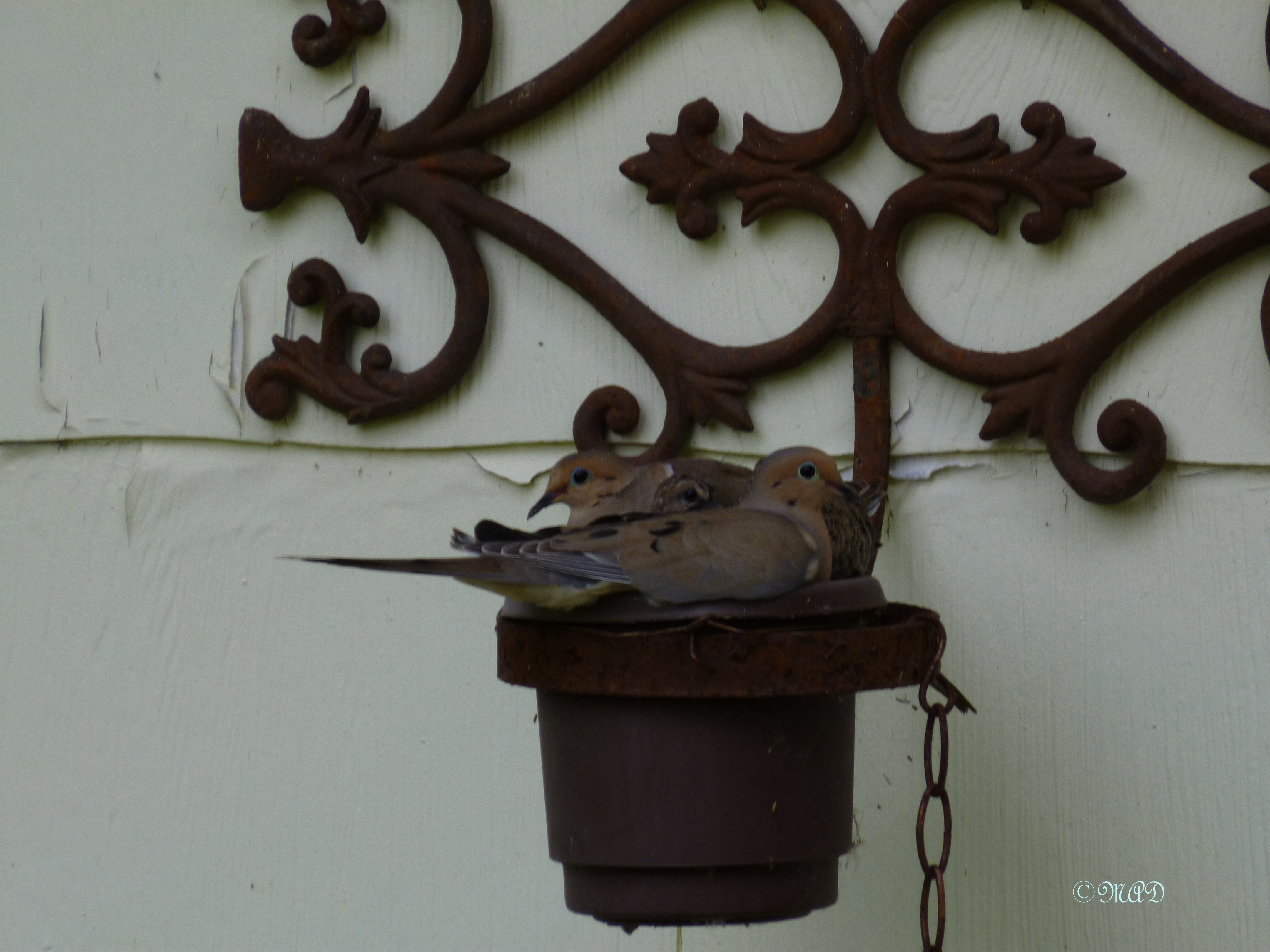 I have been outside gardening today, pulling weeds and trimming shrubs. Looked up and saw that Mr. Dove has joined the Mrs. & babies. They sat quite patiently and let me snap a photo.