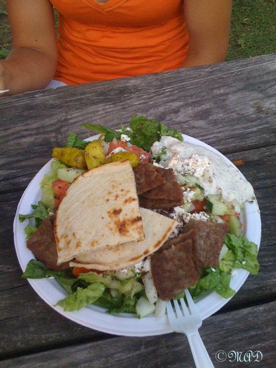 My favorite food vendor has always been the Greek food tent 37374_1450229450210_3567802_nwhere I buy the Greek salad 37411_1450234770343_3027718_nor gyros                                              and of course, an Indiana favorite, the elephant ear booth.   5016_1170377134077_4506202_nIf you haven’t had one of these delicious Indiana concoctions, they are easy to make at home, consisting of sweet yeast dough, spread out and fried in hot oil, brushed with melted butter and sprinkled with cinnamon sugar.        Of course, I only partake once a year, as they are definitely loaded with calories 😉 and it’s awfully hard to share – we usually end up getting one per person!