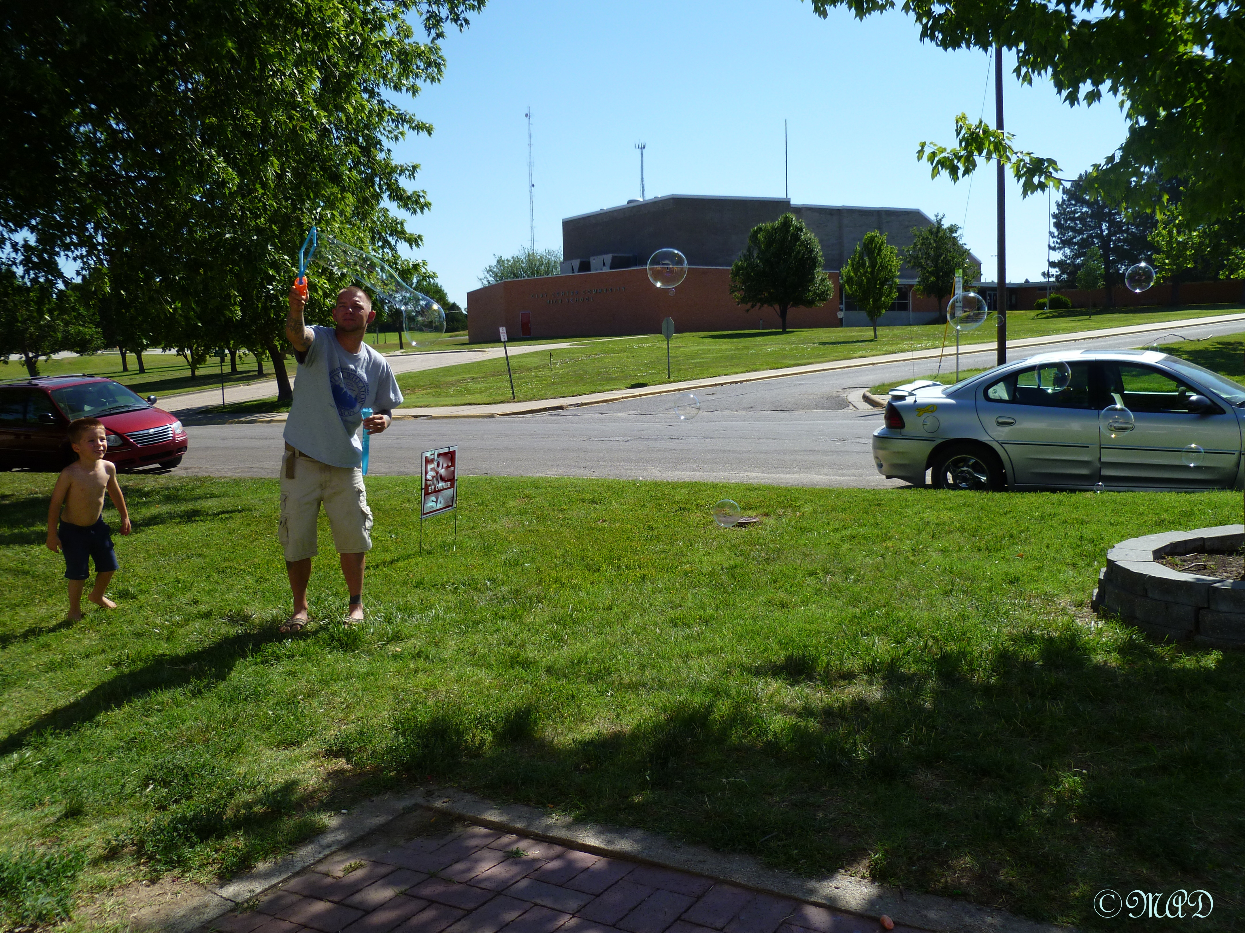 Daddy R helped, as B had trouble getting the contraption to release long bubbles.
