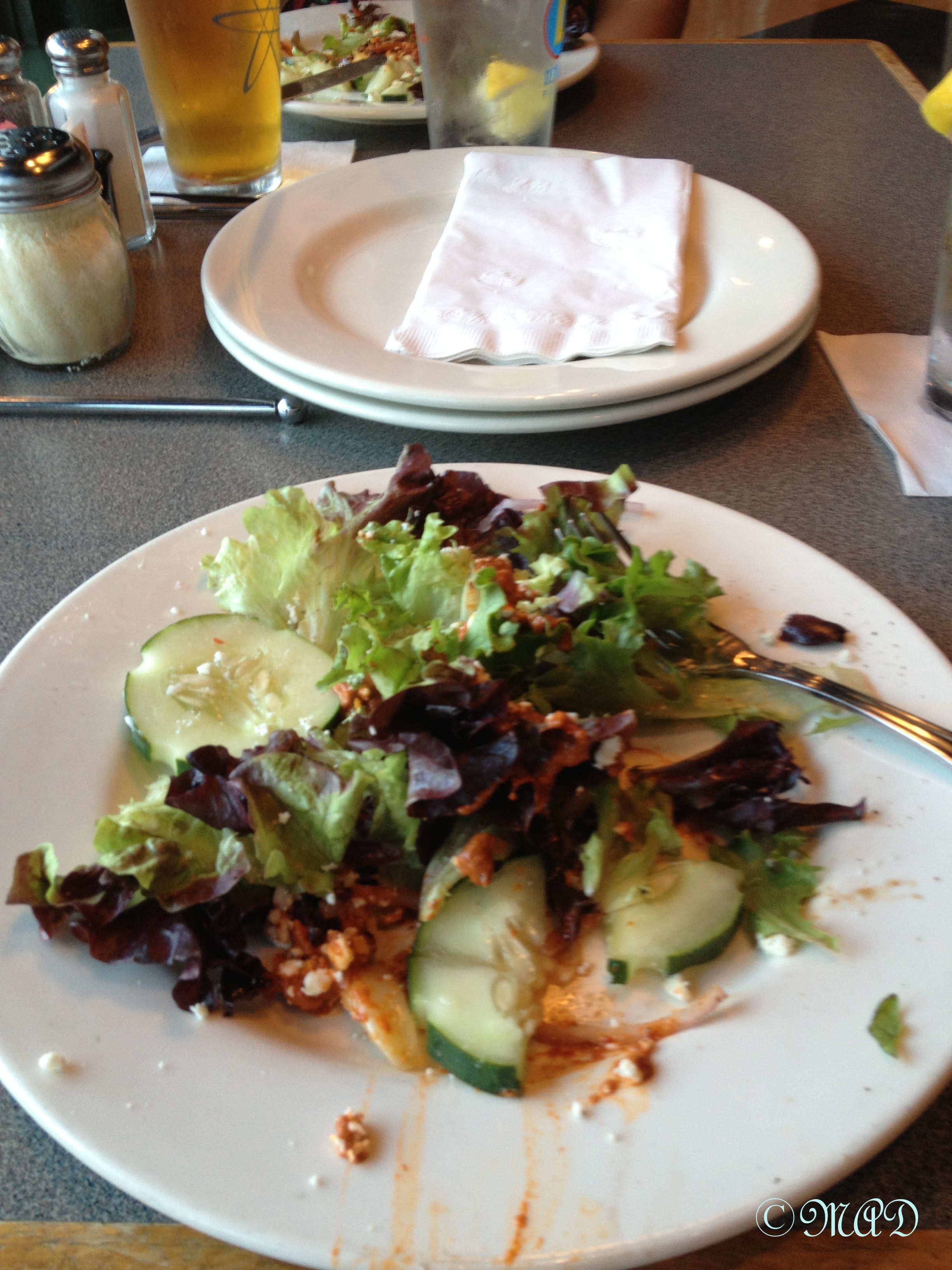 We both tried the Greek salad, which had an unusual ‘rosey red pepper vinaigrette’ on beautiful multi-colored lettuces with cucumbers, red onion, and whole roasted garlic cloves.