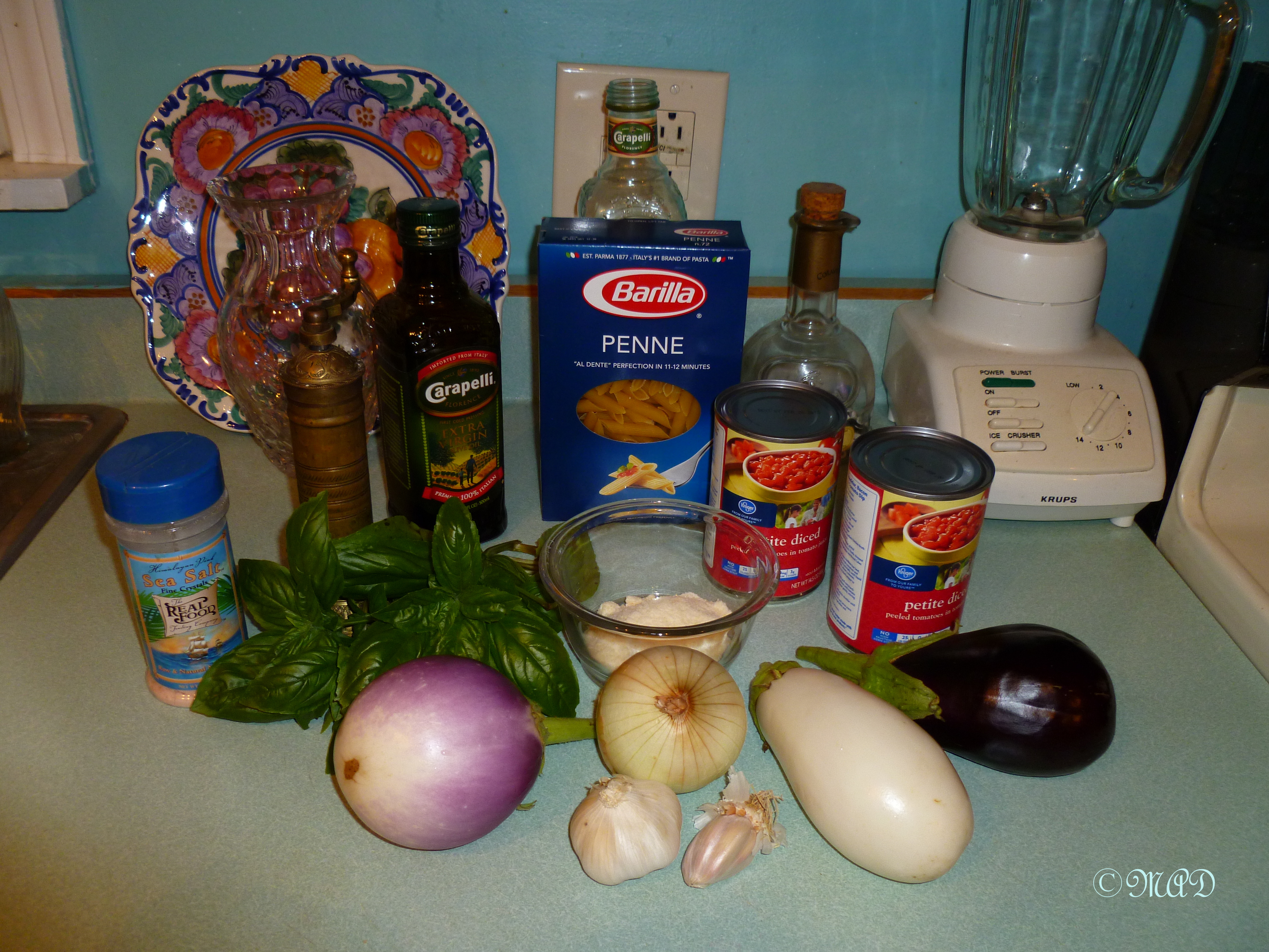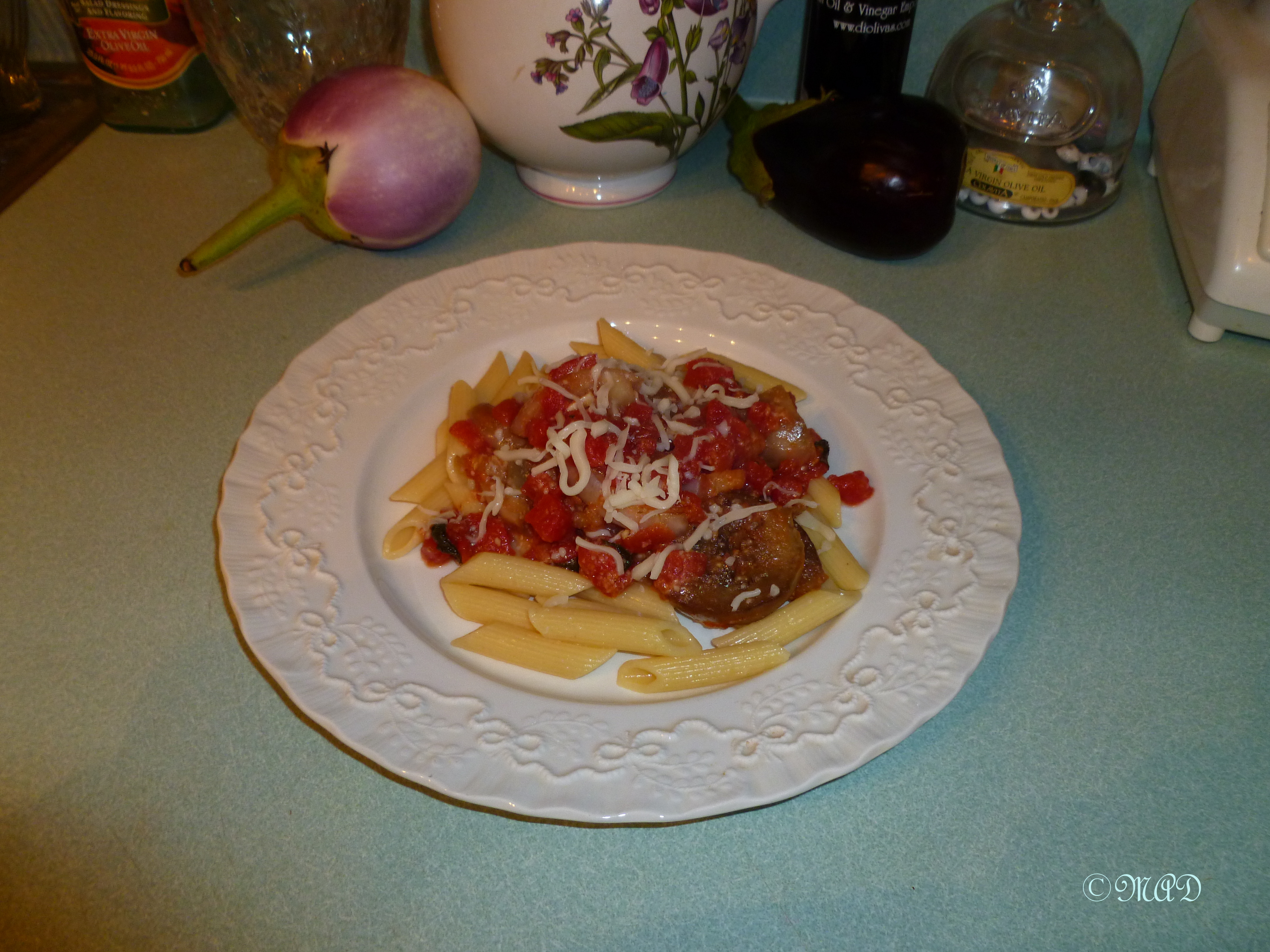 It is made with simple, yet tasty ingredients:  sliced & sauteed eggplant in extra virgin olive oil, tomatoes, fresh basil, penne pasta and ricotta salata cheese.  (I couldn’t resist adding garlic to the mix.) I was unable to find the ricotta salata cheese here, but I have been told one can use fresh ricotta or even sliced parmigiano or as I did, use mozzarella.