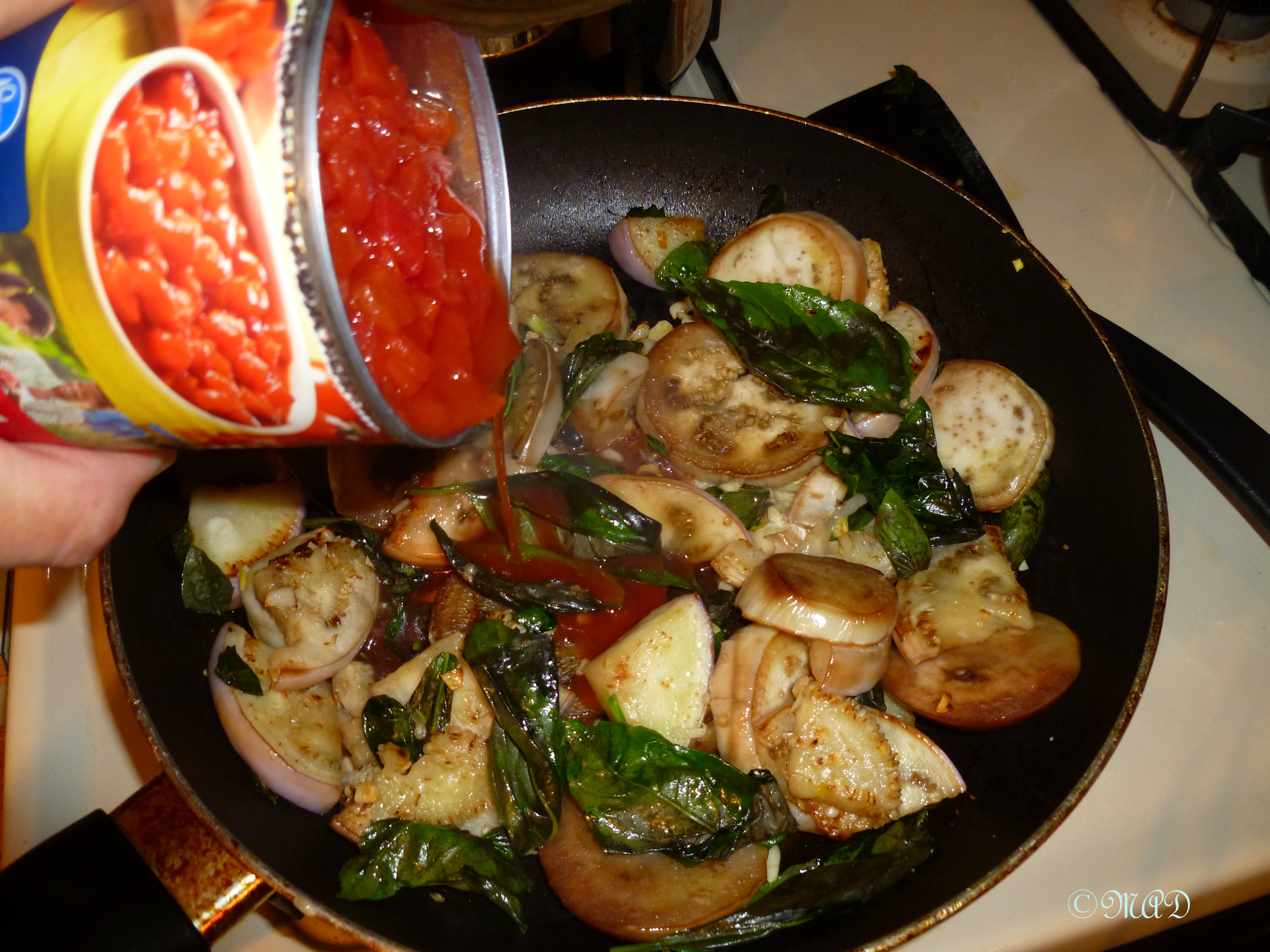 Add two cans of diced Italian tomatoes to the pan..  Stir until heated and cooked thoroughly.