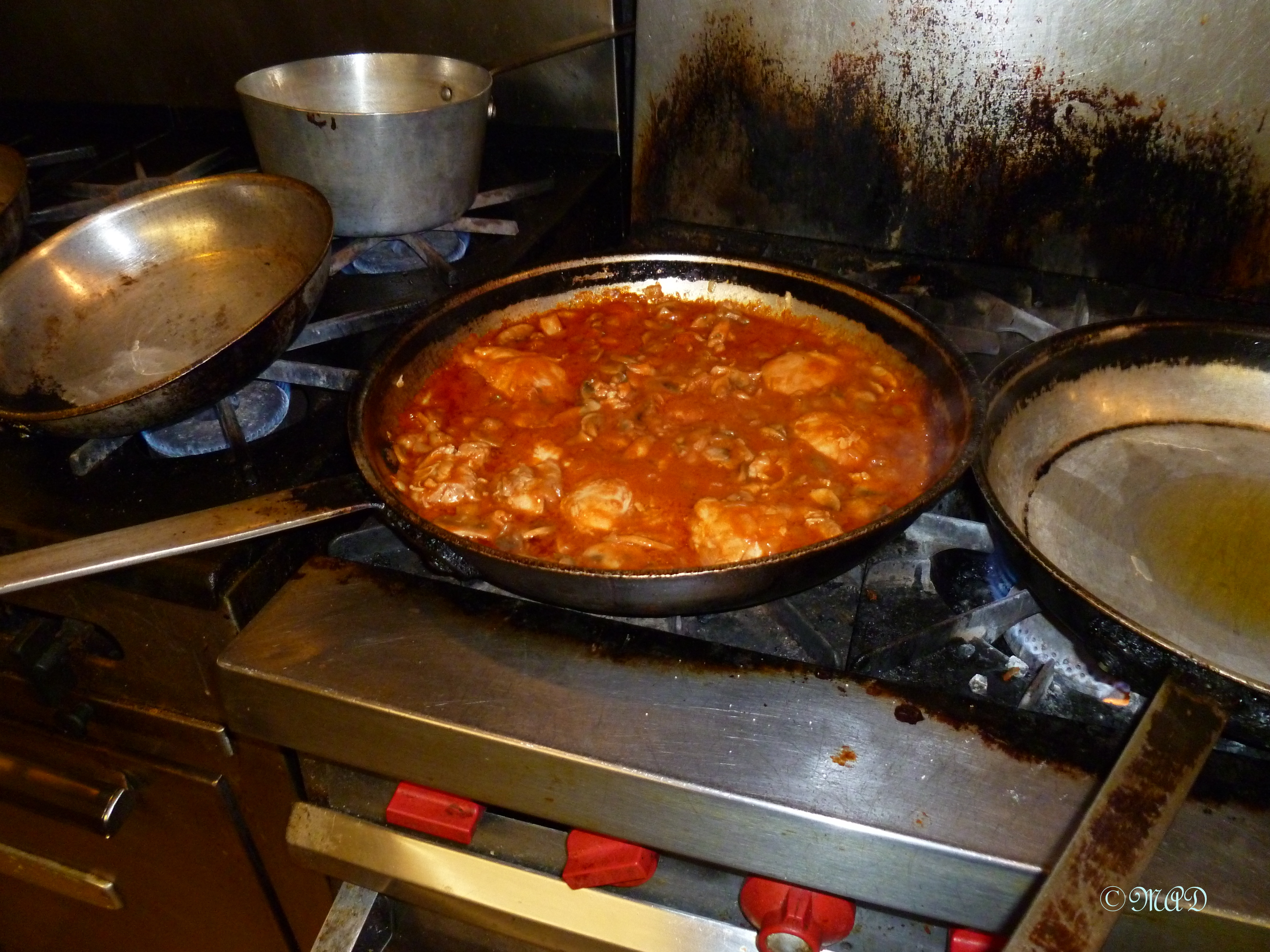 I was given a recipe for Chicken Chasseur,  which was similar to Coq au Vin.  We had eleven people there and twelve recipes, so the chef cooked one of the recipes.  He didn’t show us how to cook each recipe, he assumed we could read & assemble them ourselves and if we had any questions, we could ask for assistance from him or veteran participants.  We had about an hour and a half to prepare our dishes before we sat down to eat and it took exactly that amount of time to finish.  Since it was a Tuesday evening, the restaurant was not busy and we pretty much had the kitchen to ourselves.
