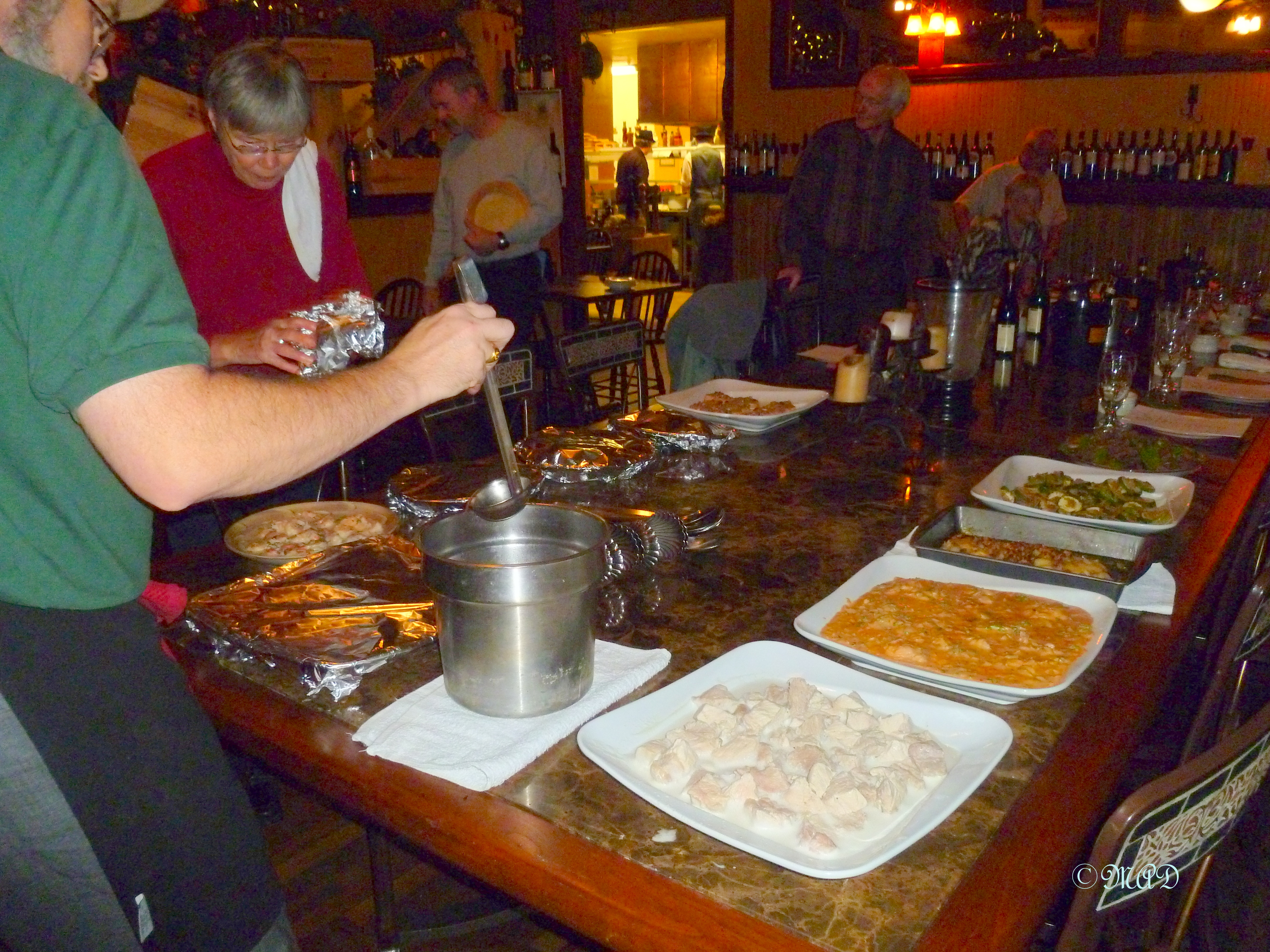 Once all the dishes were prepared, the chef helped dish up and carry the serving dishes to a big table prepared with place servings for us.  We loaded up our plates, sat down and he asked each of us to introduce ourselves, tell the group about the recipe we prepared and what we would have done differently with it and what was our favorite recipe out of the twelve.  I must confess, my dish was my favorite!  He then discussed how he might tweek or change this or that recipe and about up-coming events and classes.