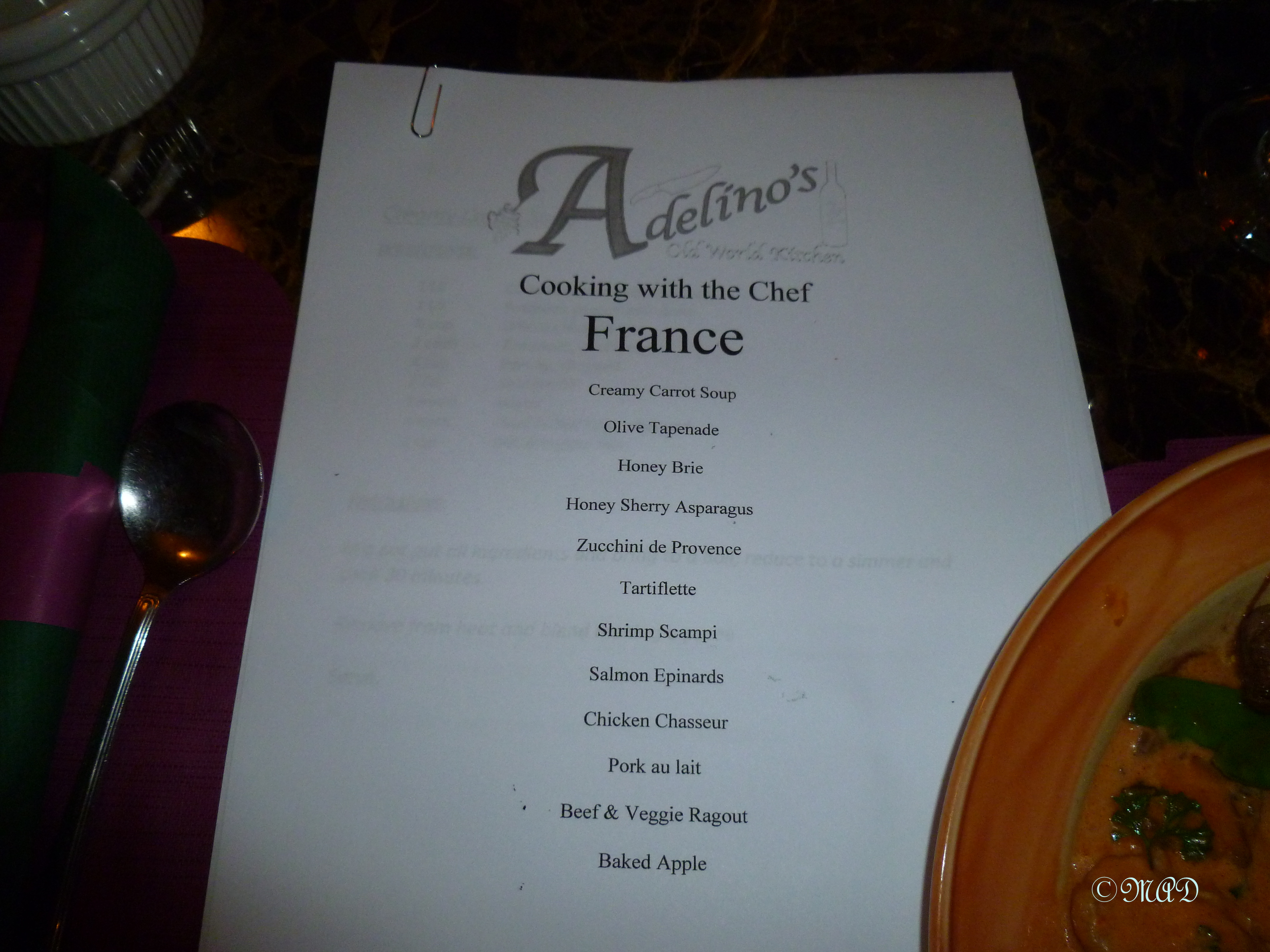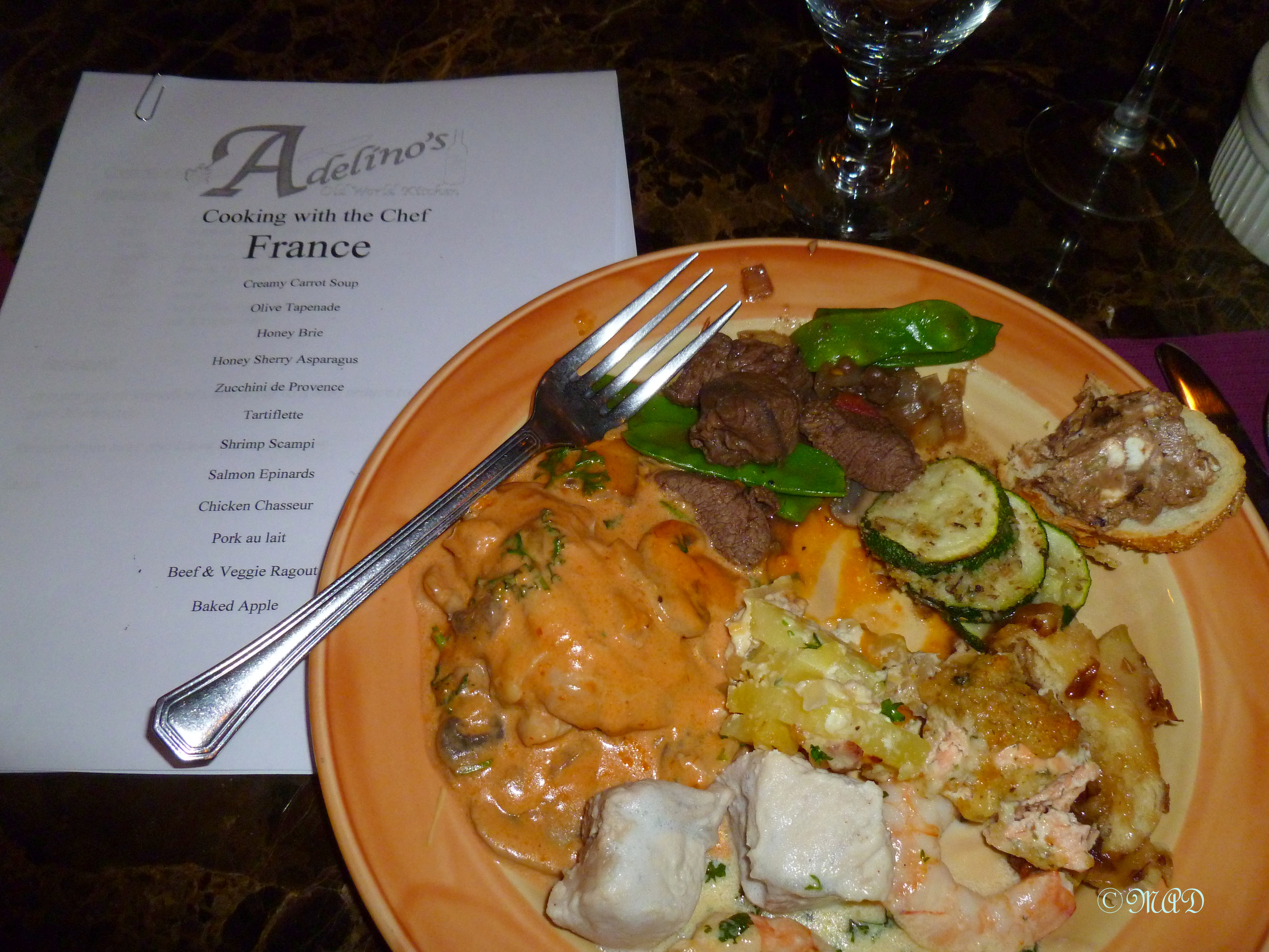 Our menu was:  Creamy carrot soup, olive tapenade, honey brie, honey sherry asparagus, zucchini de Provence, tartiflette, shrimp scampi, salmon epinards, chicken chasseur, pork au lait, beef & veggie ragout & baked apple.