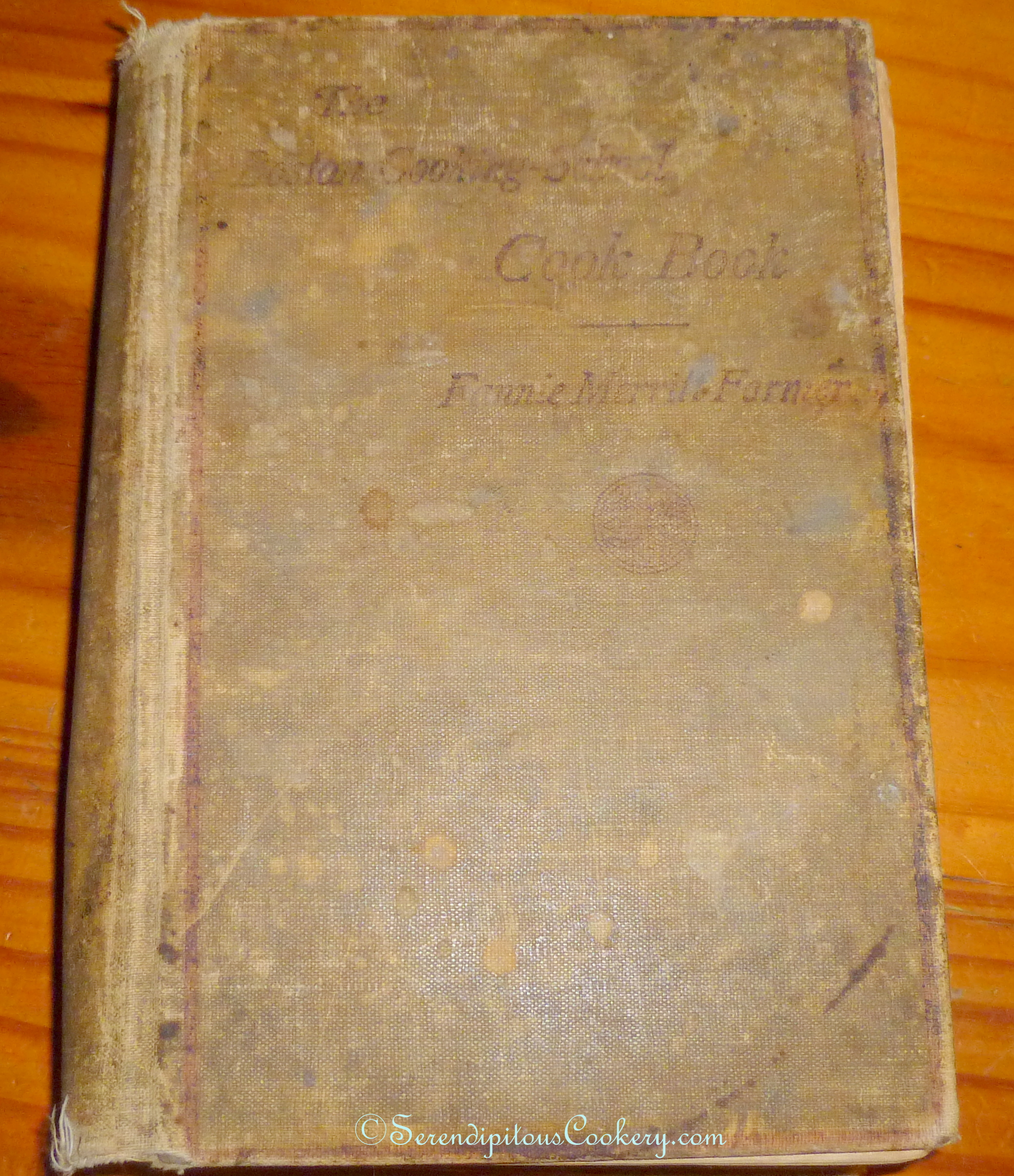 I have a collection of cookbooks here in my kitchen, nothing really exotic or expensive.  I decided to go through them to see what recipes resembled the famous Parisian macarons. There really aren’t any recipes that are similar to the delicate concoctions that come out of the Parisian confectioner shops.  The oldest cookbook I have is the Boston Cooking School Cook Book by Fannie Merrill-Farmer.  The publishing page was torn out, so after some research I deduced it is the 1906 edition.  I bought it at a flea market for a $1.00.  Here is a photo of the cookbook below: