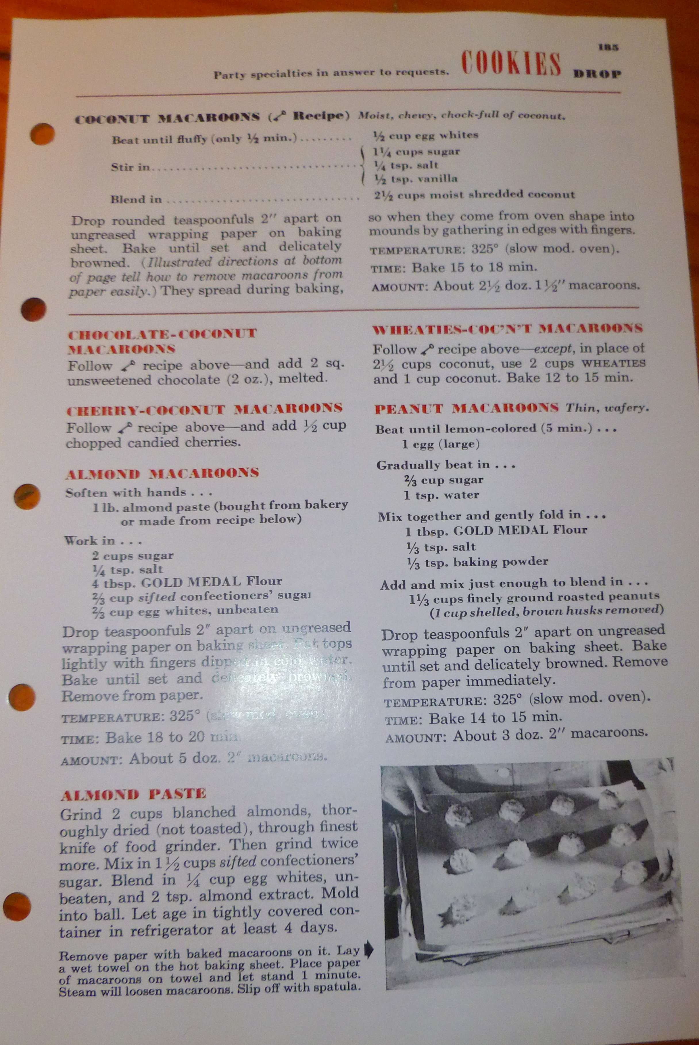 This was the cookbook my grandmother had when I was a little girl, although, it was no longer in its binder and we kept the pages scattered in a drawer in the kitchen.  When we wanted to cook something we went to that drawer to search for one.  In this cookbook is a whole page of macaron/macaroon-like recipes, you’ll notice the recipe in each book calling for almond paste are in a small way, similar to French macarons but not entirely so: