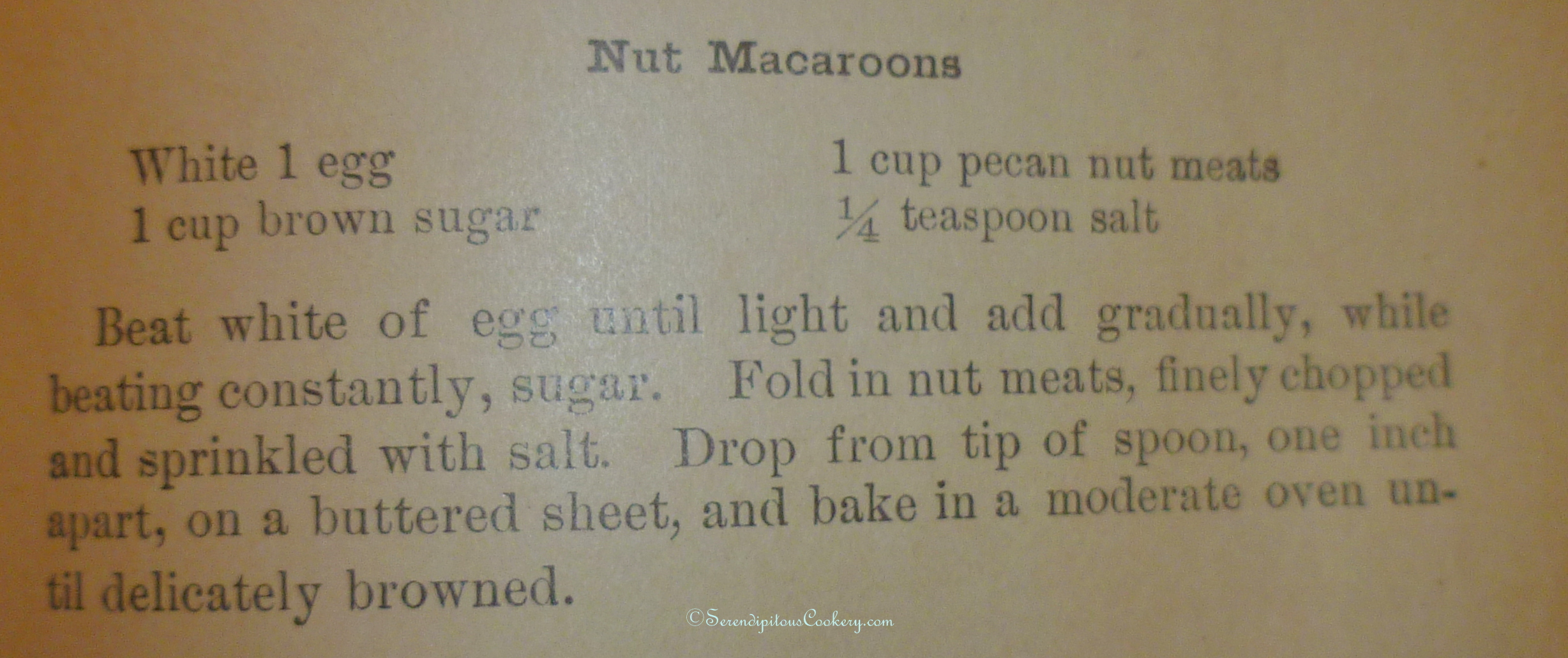 I don’t know how old the macaron or macaroon recipes are, but in this cookbook, there are two recipes that resemble, in a small way what would become the modern day recipes: