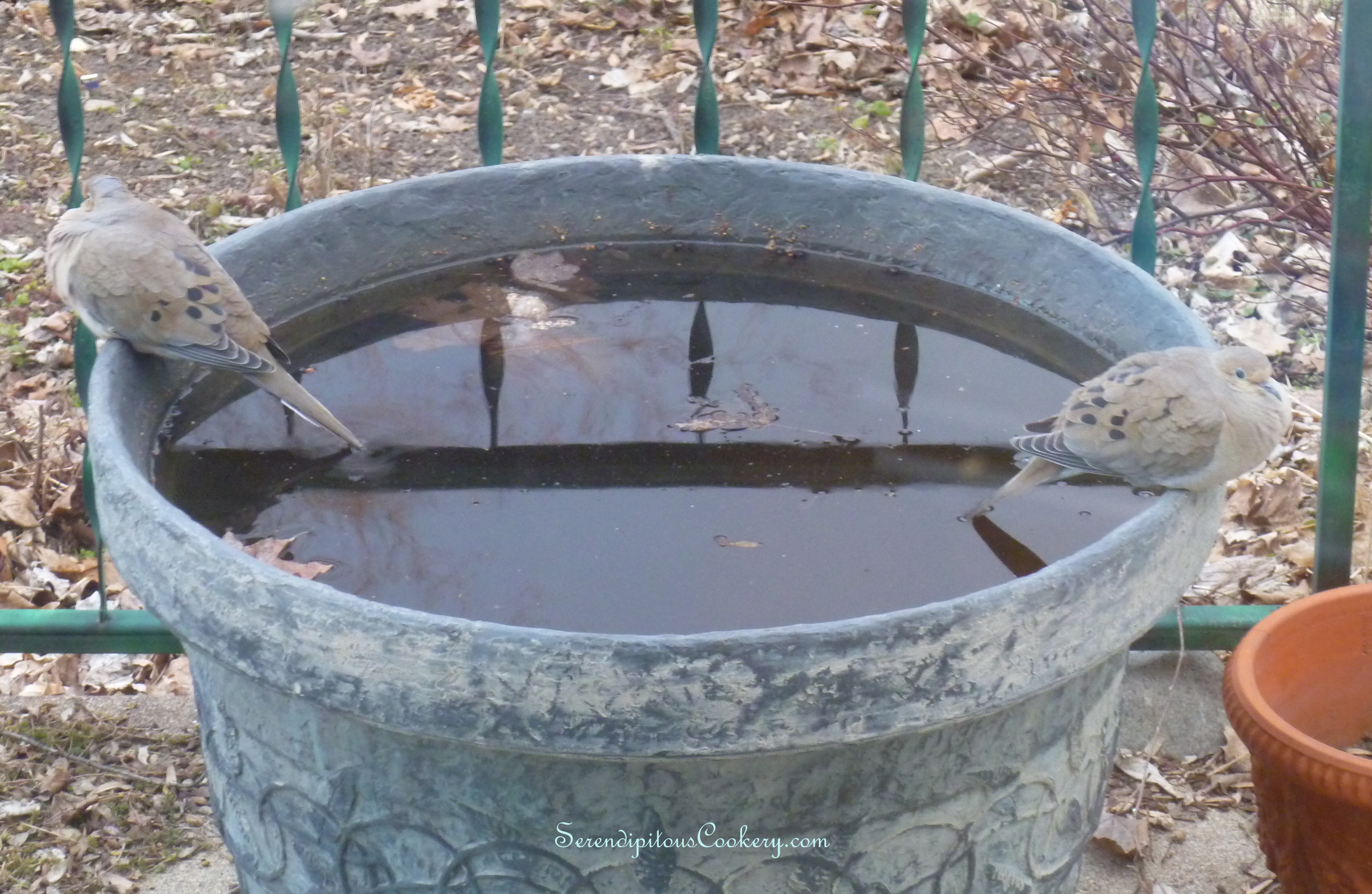 Last weekend I was sitting at my desk, sewing on a baby quilt for quite some time and happened to look out the window to my left, and there they were, Mom & Dad sitting on my water garden pot, watching me. What a pleasant surprise! I will look forward to seeing them raise more children in my hanging pot this summer. This is the 3rd year in a row that they have returned to my backyard.