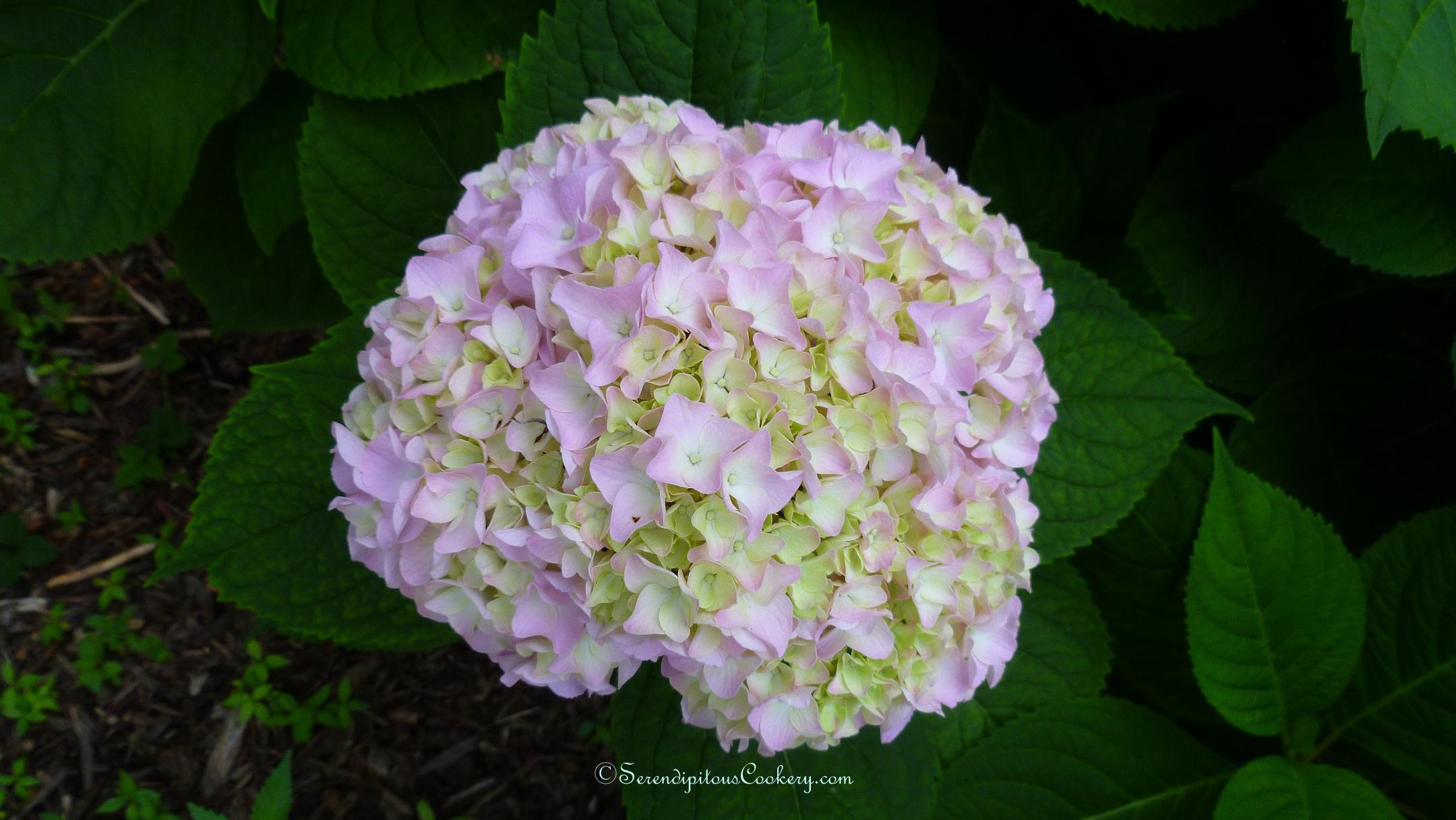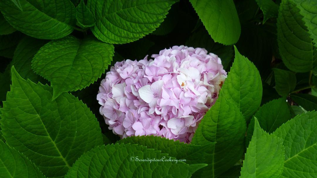 I am indeed late on this challenge, but thought of it several mornings this week as I was walking in to work. I pass by a large cathedral-like church building downtown, it’s very old and hugging the building is a perennial garden consisting of hostas and hydrangeas mostly. One morning as I was hobbling into work (you see, I tripped and fell last Sunday and broke a toe, hence the need to hobble), I spied a big beautiful pink/white/green hydrangea bloom. And next to it, hiding between the leaves was another. Because it was mostly hidden from view, it was difficult to see exactly how big it was, but I suspect it was as big as it’s companion. Several days later, I hobbled into work with my camera and captured it. Good thing too, because as I walked out to go home later that day, the big bloom had wilted in the heat.